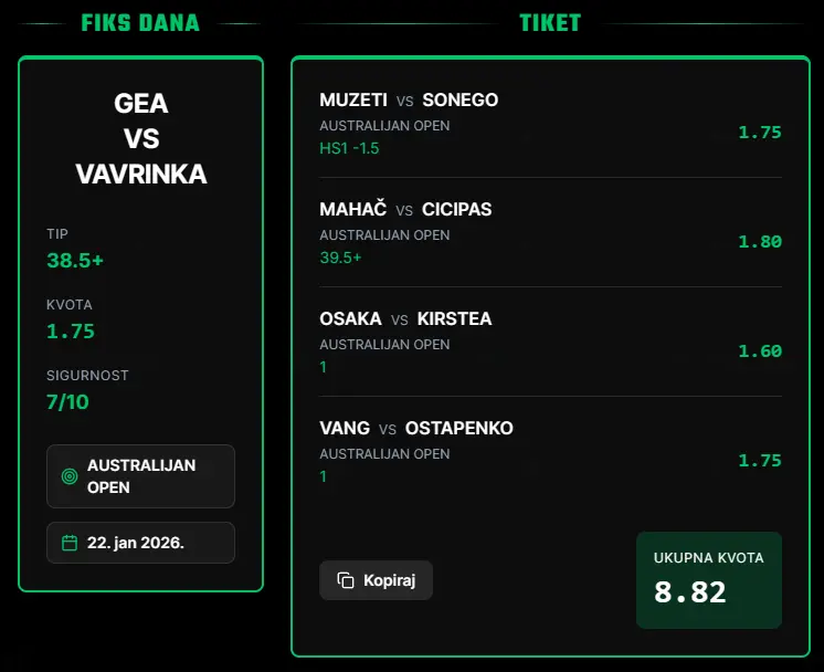 Budim se ujutru, kad ono tri popodne. Mobilnotelefonski aparat uzimam u ruke, palim ______ (sponzorsko mesto za aplikaciju za praćenje rezultata, javite se, cimanje stop, Davidovič Fokina stop) da vidim šta se to izdešavalo u Melburnu ovih nekoliko sati dok sam usnio čudan sanak kako mi Eženi Bušar kuva kafu i paprikaš za tri dana – istovremeno. Kad ono, gle čuda – NSK ispogađao sve što je mogao!